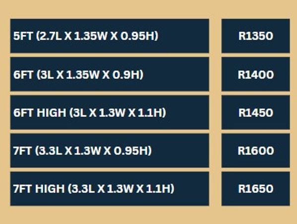 Contact us via email, phone, or WhatsApp with your specific size or the model from our list, and we will send you a quote. A 50% deposit is required for made-to-order items, while full payment is needed for ready-to-ship products. Courier delivery is available at an additional cost of R250. We are based in Brackenfell, Cape Town, and clients are welcome to collect their covers by appointment or arrange their own courier.